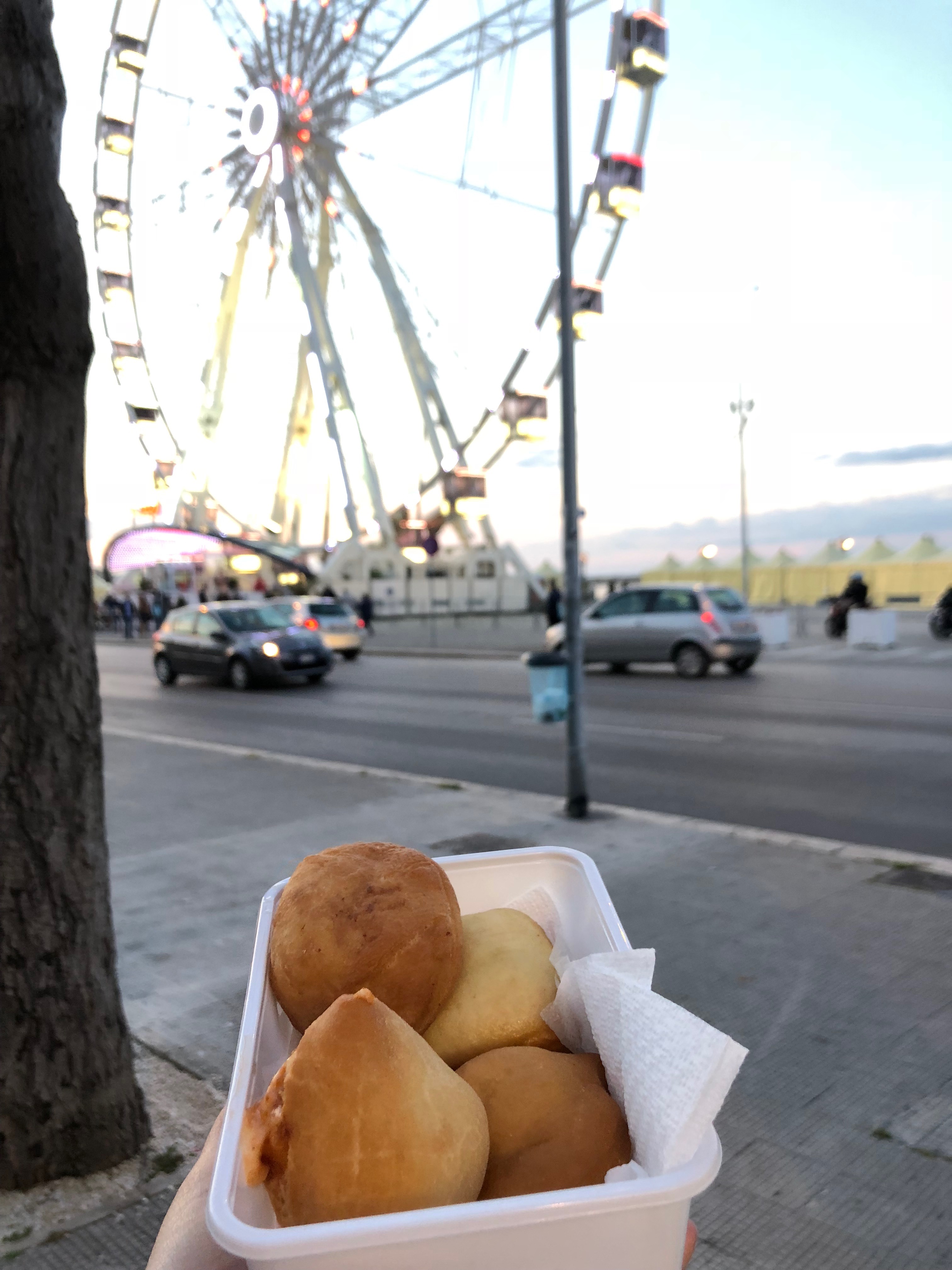 Revenind la Bari, sa trecem la subiectul delicios al zilei (si a tuturor zilelor de altfel)- mancarea. Totusi, in sudul Italiei e putin mai sensibil acest subiect. De ce? Pentru ca restaurantele au un orar ciudat care le permit proprietarilor sa inchida in mijlocul zilei si sa deschida la ora 19:30-20:00, iar ghici ce? Pana atunci trebuie sa te descurci cum poti cu foamea. Oricum, sunt foarte multe rulote cu mancare iar cu 5€ te poti satura cu diverse tipuri de panzerotti (specifice zonei Puglia), panini, covrigi, kebab etc. In caz ca te ajuta, peste drum de wheel este un food truck unde gasesti mancare buna si ai si putina priveliste, sa zicem.